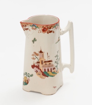 Jarra en cerámica policromada con decoración de paisaje con casas, árboles, flores y hojas. Sello en la base. Manufactura Opaque de Sarreguemines.