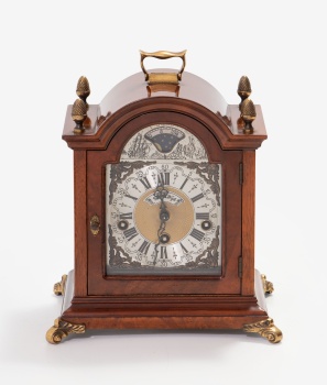 Reloj de sobremesa estilo Bracket en madera de caoba, remates en metal representando piñas. Esfera en metal plateado y dorado con decoración vegetal, bustos, barcos, personajes a caballo y números romanos. Fases de luna y sonería carrillón. Estilo Regencia.