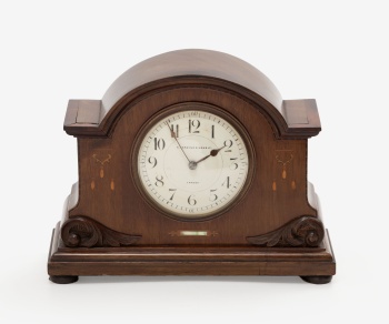 Reloj de sobremesa con forma de capilla en madera de caoba tallada y marquetería con decoración vegetal e incrustación de nácar. Esfera blanca con números árabes. Cuerda. G. Harding & Sons Ltd. London.