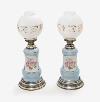 Pareja de quinqués en porcelana policromada y plateada y metal con decoración de flores y hojas. Tulipas en cristal grabado con decoración vegetal.