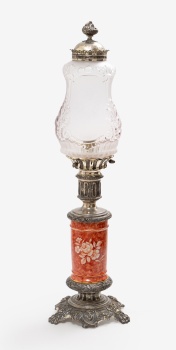 Quinqué transformado a lámpara en porcelana y bronce plateado con decoración de flores, hojas, bellotas, bustos y rematando en patas de garra. Tulipa en cristal grabado con decoración de flores y hojas. Estilo Luis XVI.