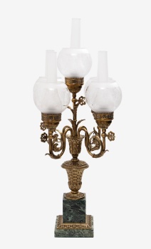 Lámpara de sobremesa de 5 luces, representando farola, en metal dorado con decoración de hojas y uvas, base en mármol verde y tulipas en cristal grabado. Estilo Luis XVI.