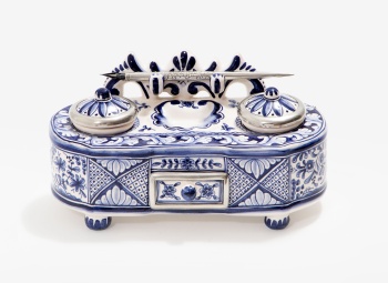 Escribanía en cerámica azul y blanca con decoración de flores, rocallas, vegetal y pluma en metal con decoración de flores y hojas. Firmado en la base. Coimbra. Portugal.