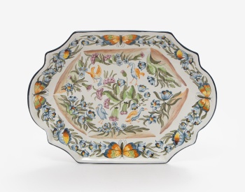 Bandeja en cerámica policromada con decoración de flores, hojas, pájaros y mariposas. Sello en la base. Manufactura Alcora.