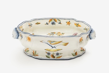 Centro en cerámica policromada con decoración de flores, hojas, aves y asas representando bustos de animales. Sello en la base. Manufactura Algora. S. R. 77
