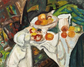 (S. XX) "Bodegón de mesa, frutas y jarra" Óleo / Lienzo 50 x 61 cm.