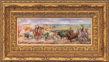 (Bilbao 1928 - 2011) "A encerrar" Firmado: García Campos Óleo / Táblex 14,5 x 34 cm.; 28 x 49 cm. (con marco)