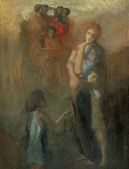 (Uruguay en 1940) "Maternidad y niños " Firmado: Pombo 85 Óleo / Lienzo 130 x 103 cm. ; 150 x 120 cm. (con marco) Al dorso titulado y firmado