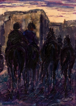 (Irún 1940) "Muralla de Hondarribia con personajes a caballo" Firmado: J. Montes 98 Óleo / Táblex 33 x 24 cm. ; 57,5 x 48,5 cm. (con marco) Sello en el bastidor Galería de arte Kokoschea.