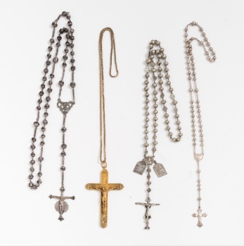 Lote compuesto por 2 rosarios en metal plateado representando: Cristo de Limpias, San Antonio y Jesucristo en la Cruz y rosario en plata con Jesucristo en la cruz y cadena y colgante en metal representando a Cristo en la cruz.