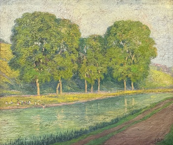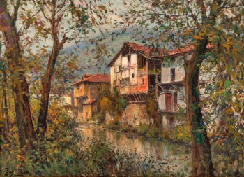 (Logroño 1913 - Bilbao 1995) "Casa junto al río. Orozco" Firmado: Bay Sala Óleo / Lienzo 60 x 81 cm.; 81 x 101 cm. (con marco) Al dorso titulado y firmado