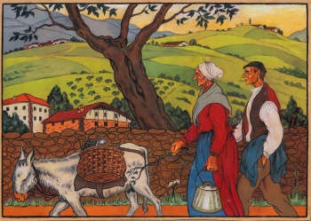 (Pp. S. XX) "Paisaje vasco con lechera , aldeano y burro " Guache / Papel pegado a cartón 29 x 40 cm.