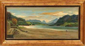 (Bilbao 1911-1985) "Ría de Guernica" Firmado: Largacha Óleo / Lienzo 40,5 x 101 cm. ; 57,5 x 118 cm. (con marco) Al dorso titulado, firmado y fechado 63.
