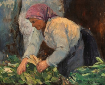 (Galdames, Vizcaya 1941) "Aldeana en la huerta " Firmado: J. García Totorika Óleo / Lienzo 60 x 73 cm. ; 82 x 95 cm. (con marco)