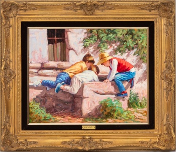 (Valencia 1933) "Jugando" Firmado: José Lull Óleo / Táblex 50 x 40 cm. ; 63,5 x 73,5 cm. (con marco) Al dorso titulado, firmado y fechado 1985