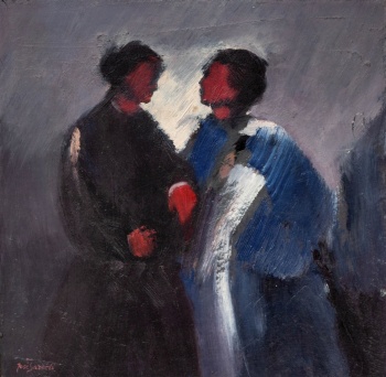 (Cartagena, Murcia 1923 - Bilbao 2001) "Pareja " Firmado: José Barceló Óleo / Tabla 23 x 23 cm. ; 42 x 42 cm. (con marco)