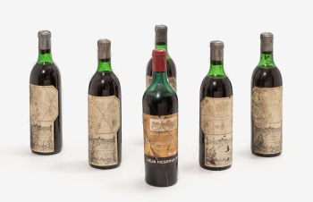 Lote compuesto por 6 botellas de vino: 5 botellas de vino tinto Herederos de Marqués de Riscal. Reserva 1969. Elciego. Álava y 1 botella de vino Rioja clarete fino. Vieja Reserva 1928. Bodegas Bilbaínas. Bilbao - Haro.