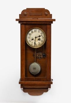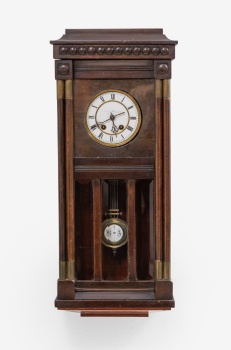Reloj de pared en madera de caoba tallada con decoración geométrica y columnas a los lados con remate en metal. Esfera en metal esmaltado en blanco con números romanos y sonería horas y medias. Estilo Luis XVI. Bilbao. Época Modernista.