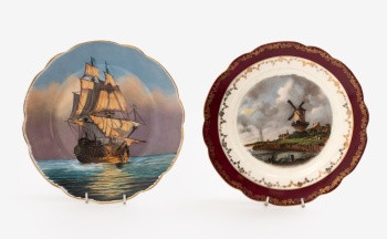 Lote compuesto por plato en porcelana policromada y dorada con decoración de carabela. Sello en la base. Manufactura Bidasoa y plato en porcelana policromada y dorada representando paisaje con río, molinos, personajes, rocallas y greca de flores. Sello en la base. Manufactura Limoges.