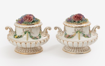 Pareja de centros con tapa en porcelana policromada y dorada con decoración de guirnaldas, lazos, rocallas y bouquet de flores en la tapa. Estilo Luis XVI.