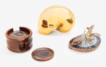 Lote compuesto por figura en plata representando cisne con base de ágata, juego de 6 posavasos en ágata y figura en resina representando caracola dorada.