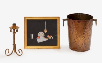 Lote compuesto por: candelero en metal dorado con 3 patas, cuadro de cocina con decoración de frutas y utensilios de cocina y hielera en cobre.