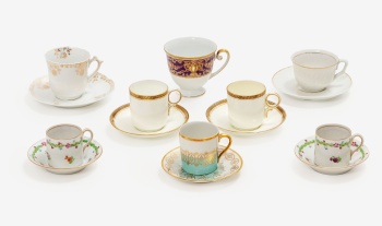 Lote compuesto por tazas y platos de colección en porcelana policromada y dorada con decoración vegetal, flores y greca neoclásica alrededor. Estilo Luis XVI. De diferentes manufacturas: Manufactura Bavaria. Alemania, T. Coode & Cº. London, etc.