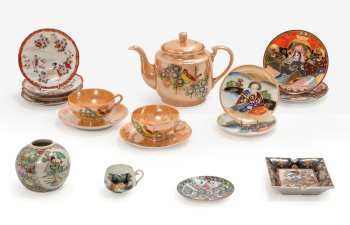 Lote compuesto por 9 platos orientales en porcelana policromada y dorada con decoración de budas, geishas, flores, aves, paisaje, etc. Tetera y 2 tazas y platos orientales con decoración de flores y pájaros. Sello en la base.