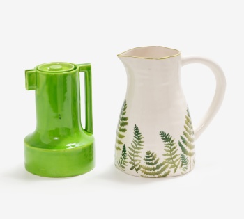 Lote compuesto por jarra en cerámica policromada con decoración de hojas. Sello en la base. Manufactura Amadeus y cafetera en porcelana esmaltada en verde.