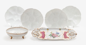 Lote compuesto por 4 platos de ostras en porcelana esmaltada en blanco con decoración vegetal. Sello en la base. Alemania. Centro para flores en porcelana blanca y dorada con decoración geométrica y bandeja rectangular en porcelana policromada y dorada con decoración de flores, hojas y rocallas. Sello en la base. Manufactura Hispania.
