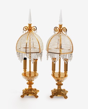 Pareja de lámparas de sobremesa en metal dorado y cristales con decoración vegetal, gallones, perlas y rematando en patas de garra. Estilo Regencia.