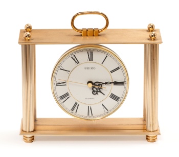 Reloj de sobremesa en metal dorado con columnas a los lados y asa. Esfera blanca con números romanos. Cuarzo.