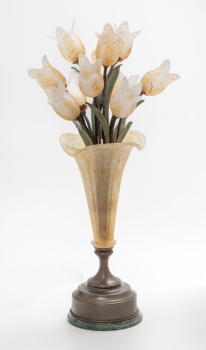 Lámpara de sobremesa en cristal y metal pintado representando jarrón con tulipanes. Base en metal patinado y símil de mármol.
