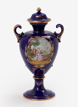 Jarrón con tapa en porcelana policromada y dorada con medallón central representando escena galante, flores y rocallas. Sello en la base. Estilo Luis XVI.