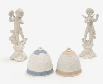 Lote compuesto por pareja de figuras en porcelana esmaltada blanca representando ángeles músicos y pareja de campanas en biscuit blanca, azul y beige con decoración de Reyes Magos, ángeles músicos y estrellas. 1989 y 1990. Sello en la base. Manufactura Lladró.