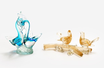 Lote compuesto por 2 figuras en cristal color azul y dorado representando cisnes y pájaros en la rama de un árbol.