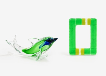 Lote compuesto por portafotos en cristal de Murano en tonos verdes con decoración de flores y figura en cristal de Murano color verde y azul representando delfín.