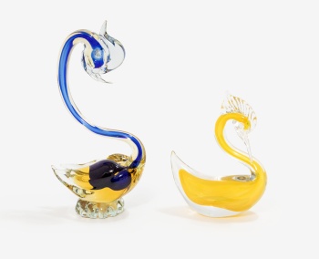Lote compuesto por 2 figuras en cristal de Murano color amarillo y azul representando cisnes.