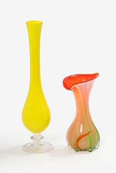 Lote compuesto por jarrón en cristal de Murano amarillo y violetero en cristal de Murano color naranja y verde representando una flor.