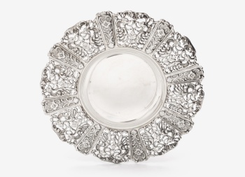 Bandeja redonda en plata calada con decoración de animales, flores, hojas y rocallas. Estilo Luis XVI. Marcas de platero.