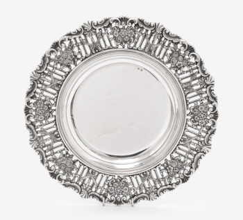 Bandeja redonda en plata calada con decoración de flores, hojas y rocallas. Estilo Luis XVI. Marcas de platero.