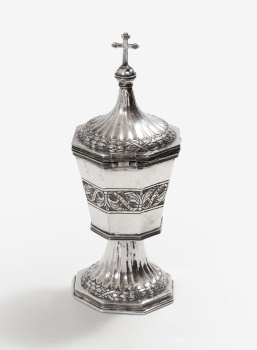Copón en plata con decoración vegetal, rocallas, lazos y cruz en la tapa. Siguiendo modelos del S. XVI. Marcas de platero.