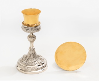 Cáliz en plata y plata dorada con decoración vegetal, flores, hojas de parra, uvas, perlas y base representando el ojo de Dios. Patena en plata dorada. Estilo Luis XVI. Marcas del platero Mucharraz.