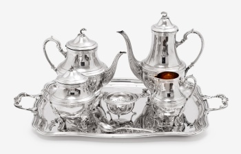 Juego de café y bandeja en plata con decoración vegetal, flores y rocallas, compuesto por: cafetera, tetera, lechera, azucarero y colador. Estilo Luis XVI. Marcas del platero Cruz de Malta.
