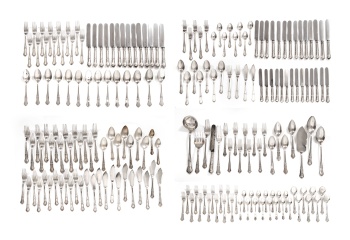 Cubertería en plata con decoración de lazo compuesta por 200 piezas: 18 cucharas de mesa, 29 tenedores de mesa, 14 cuchillos de mesa, 14 cucharas cadete, 14 tenedores de cadete, 14 cuchillos de cadete, 14 tenedores de pescado, 14 palas de pescado, 10 cucharas de postre, 14 tenedores postre, 14 cuchillos de postre, 8 cucharillas de helado, 15 cucharillas de moka y 8 piezas de servir: cazo, 2 cucharones, 2 tenedores de trinchar, cuchillo, pala y tenedor de servir pescado. Estilo Luis XVI. Marcas del platero Duran, etc.