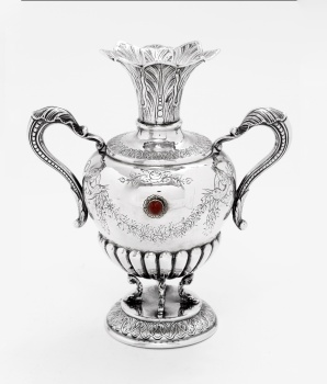 Jarrón en plata con decoración de guirnaldas de flores, hojas, gallones, aves, patas representando peces y piedras cabujón. Estilo Luis XVI.