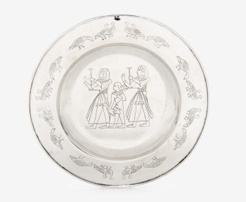 Plato en plata con decoración de personajes egipcios y aves alrededor. Marcas de platero.
