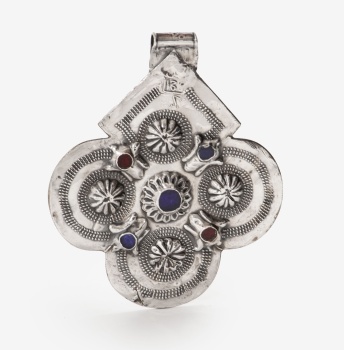 Fulet en plata con forma cuadrilobulado y cabujones de colores. Marcas de platero. Marruecos