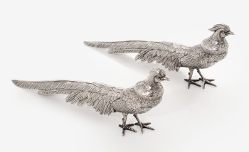 Pareja de figuras en plata representando faisanes. Marcas de platero.