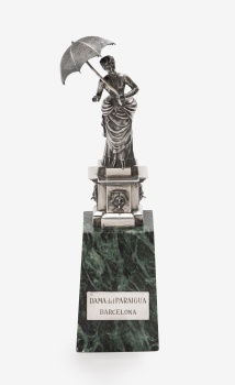Figura en plata representando "Dama del paraguas". Barcelona. Base en mármol. Marcas de platero.